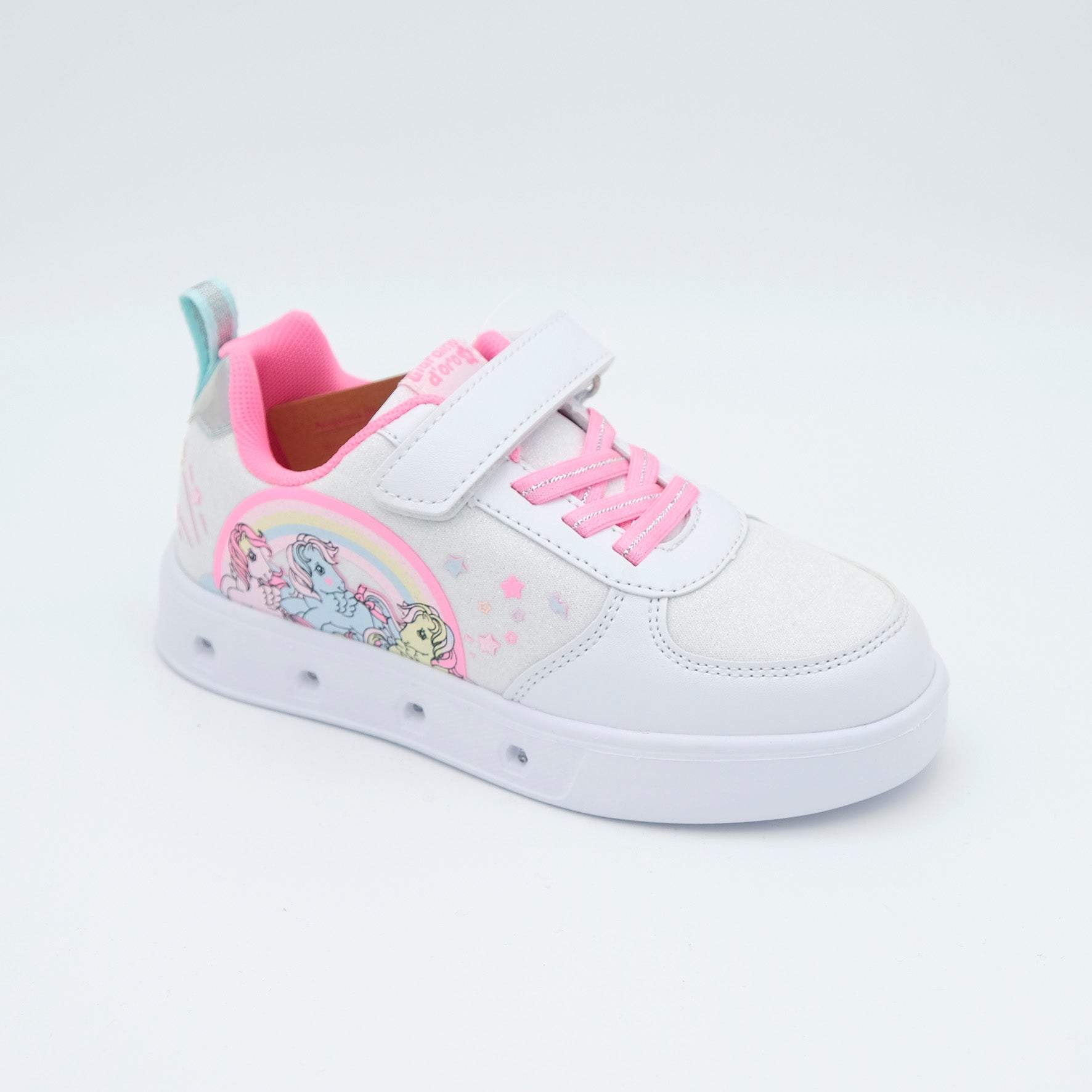 Scarpe sportive per bambina con un tocco di magia! Queste sneakers sono arricchite da un design ispirato agli unicorni e da luci integrate nella suola, che si accendono ad ogni passo per un effetto sorprendente. Dotate di chiusura a strappo e lacci elastici, garantiscono una calzata pratica e sicura. Perfette per portare allegria e stile a scuola, al parco o in ogni occasione speciale. Un mix di comfort e fantasia per le piccole sognatrici!