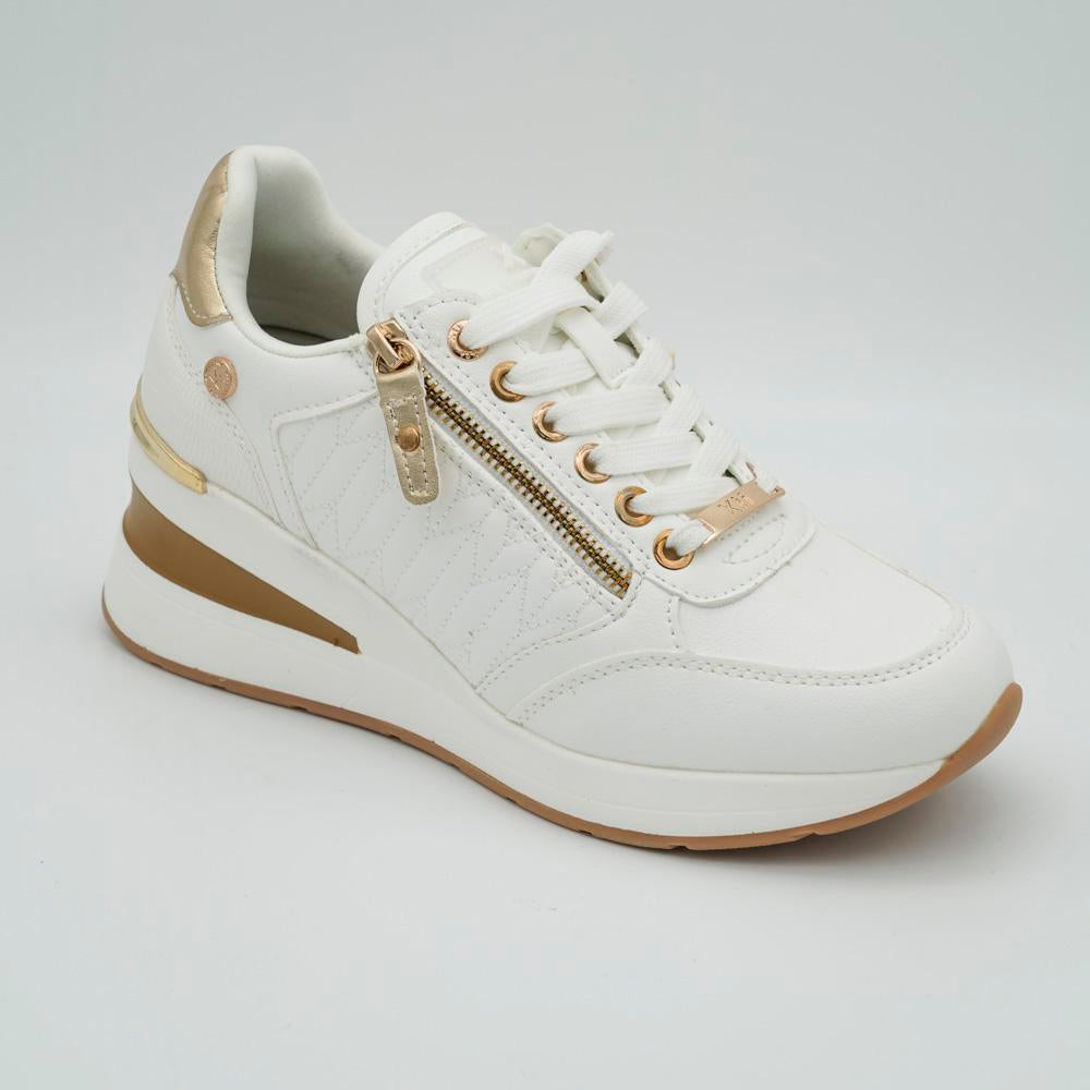 Questa sneaker XTI con zeppa interna è l’ideale per chi desidera unire comfort e femminilità. Realizzata con una tomaia elegante arricchita da dettagli metallici e zip laterale decorativa, dona subito un tocco glamour al tuo look. La zeppa integrata slancia la figura senza rinunciare alla comodità, mentre la suola ammortizzata garantisce stabilità e leggerezza a ogni passo. Perfetta per completare outfit casual chic o per rendere più sofisticati gli abbinamenti di tutti i giorni. Una scarpa versatile e moderna che non passa inosservata.