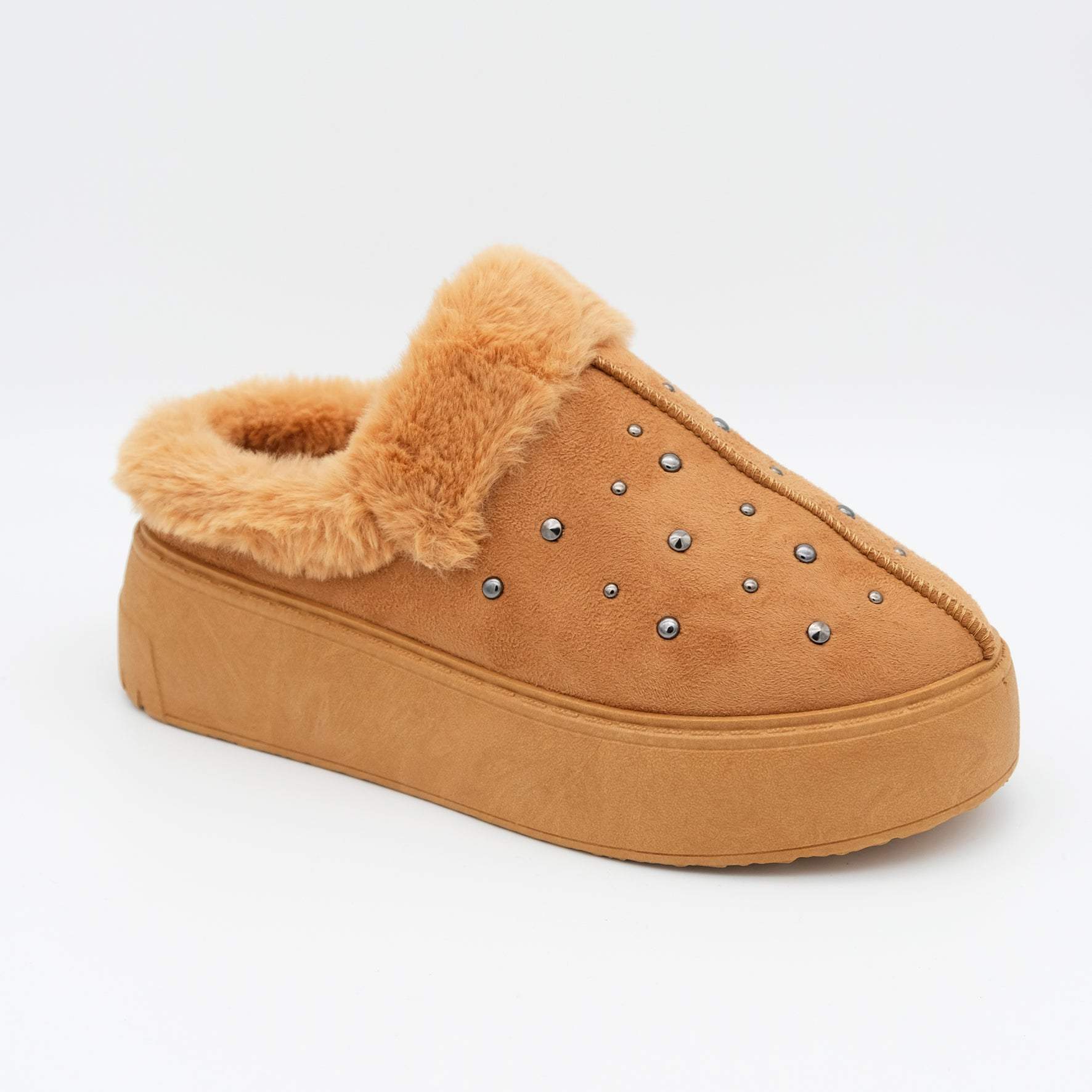 Questa pantofola elegante e progettata per offrire massimo comfort e stile. La sua tomaia e decorata con piccole borchie metalliche, aggiungendo un tocco moderno al design classico. Il bordo in pelliccia sintetica garantisce calore e morbidezza, rendendo queste pantofole perfette per le giornate piu fredde. La suola piatta e resistente offre stabilita e durata, consentendo di indossarle comodamente anche su superfici dure. Ideali per chi cerca una combinazione di eleganza e praticita nel comfort quotidiano.