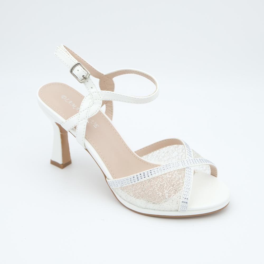 Questa sandalo elegante con cinturino alla caviglia è pensato per chi desidera brillare con classe. Il design con incrocio anteriore arricchito da luminose applicazioni e inserti in pizzo dona un tocco di romanticismo e femminilità, mentre il tacco sottile ma stabile slancia la figura con grazia. Perfetto per cerimonie, eventi o serate speciali, è il dettaglio che completa ogni outfit da sogno.